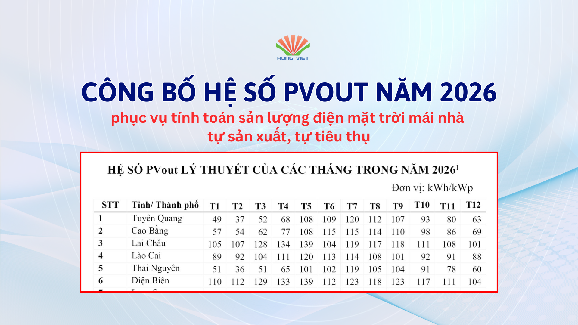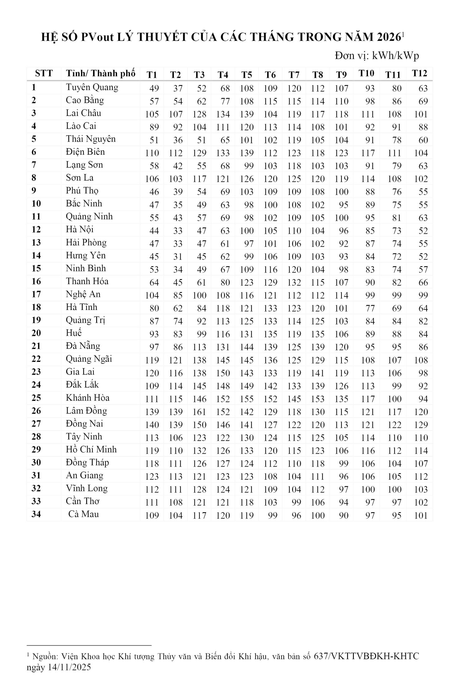 Căn cứ Văn bản số 10141/BCT-ĐL&NLTT ngày 23/12/2025 của Bộ Công Thương và Văn bản số 578/BNNMT-KTTV ngày 19/01/2026 của Bộ Nông nghiệp và Môi trường về việc công bố Hệ số PVout năm 2026 phục vụ tính toán sản lượng điện mặt trời mái nhà tự sản xuất, tự tiêu thụ theo Nghị định số 58/2025/NĐ-CP ngày 03/3/2025 của Chính phủ;