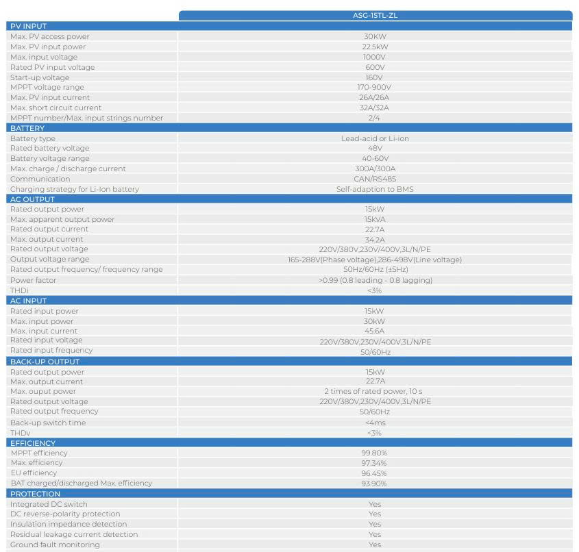 Thông số kỹ thuật của biến tần Hybrid Auxsol 15kW ASG-15TL-ZL: