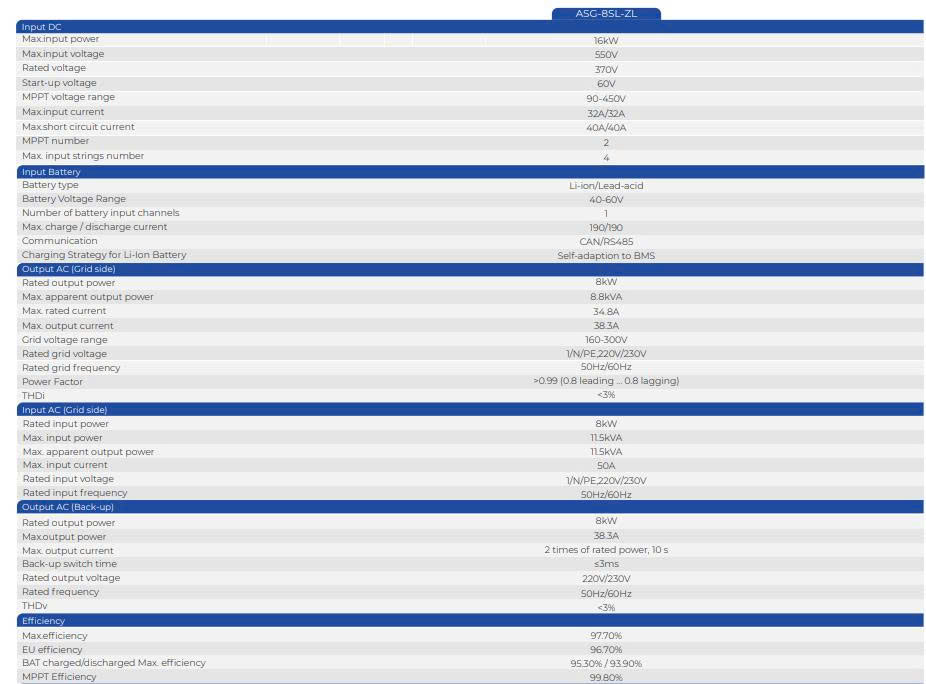 Thông số kỹ thuật của biến tần Auxsol Hybrid 8kW ASG-8SL-ZL: