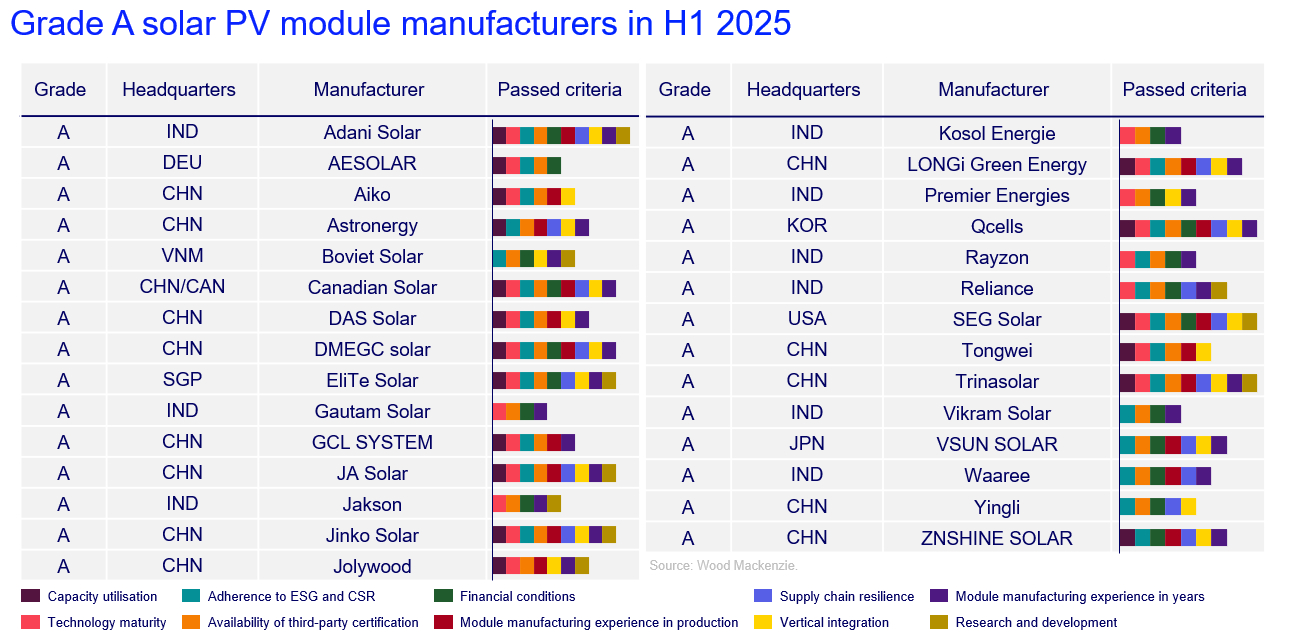 Bản xếp hạng cập nhật lần này cũng lần đầu giới thiệu phân hạng “Grade A”, nhằm đặt ra một chuẩn mới về vận hành và tính “bankable” (mức độ đáng tin cậy trong thẩm định mua sắm/tài chính dự án). Theo bà Hryshko, “Grade A” là tín hiệu quan trọng cho thị trường hạ nguồn vì nó chuyển trọng tâm khỏi chỉ số lượng xuất xưởng, để làm nổi bật những nhà cung cấp đáp ứng tiêu chuẩn mua sắm toàn cầu nghiêm ngặt, đồng thời giúp chủ đầu tư và chủ sở hữu tài sản có “công cụ” rõ ràng hơn để giảm rủi ro. Có 29 nhà sản xuất từ 9 quốc gia lọt danh sách Grade A cho H1/2025.