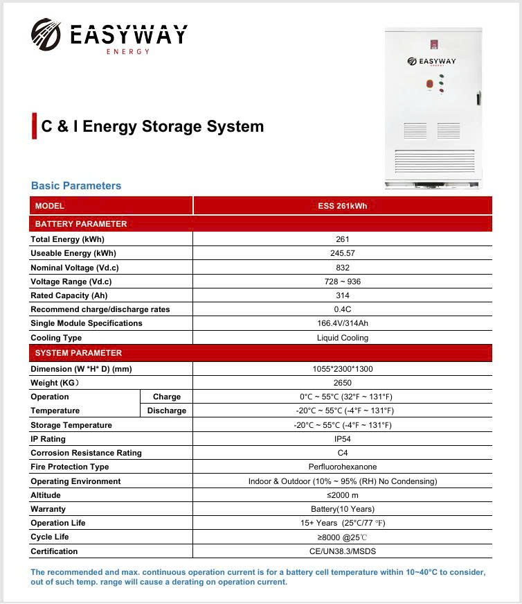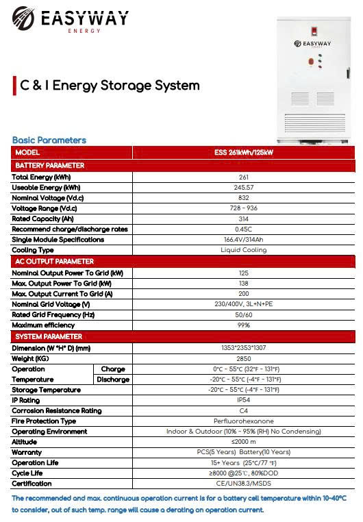 Thông số kỹ thuật của Lithium baterry Easyway ESS 261kWh/125kW: